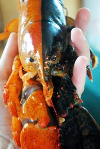 “We’ve caught a couple of calico ones, with orange and black spots, and we’ve seen some blue ones,” said Anna Mason of Ship to Shore Lobster Co., “but I’d never seen one that was half-red like that, split right down the middle.”