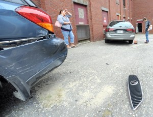 Danielle Martin, left, reacts Tuesday while telling bystanders how her car, right, lost its brakes coming down Chestnut Street in Lewiston where she lives, hit Leah Philippon’s car at left and struck the wall of Maine Heritage Weavers. She later realized the fish tank in the back seat of her car was half empty and Blue, the Betta fish she was tending for her brother’s girlfriend, was flopping around on the seat. She scooped it up, put it in the tank on the ground at right and it began swimming around. There was no significant damage to the building.