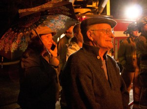 Soon, fire engines arrived in a slow procession. The gleaming red trucks parked along the curb and idled while 26 uniformed firefighters stepped onto the dewy lawn and waited quietly under bright floodlights.
