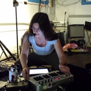 New York’s Jonas Bers used the ceiling of the space for visually stunning light projections, inviting the audience to lie down to get the full effect of his “modern witchcraft,” partially created by the output of synthesizer modules and ambient room noise fed into circuit-bent video editing equipment. The stage moved from the front of the room to the back and even to the middle of the room, each transition directed by Dr. Eric Mitchell, a retired military surgeon who, besides being an entertaining master of ceremonies, ran a tight ship. When one of the performing groups said they’d need about three minutes to set up, he responded, “I’ll give you two.”