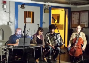 A magical aspect of Frantasia is the energetic collaboration among the artists to create new sounds and experiences. Some of these ensembles are planned in advance, while others form at the concert itself, called “jump ins.” If, Bwana teamed up his computer music mastery with Broadcloth’s experimental acoustic chamber music ensemble, comprised of cello, accordion and voice. Kaethe Hostetter joined Waterville’s Umber Owler, who played flute and other instruments.