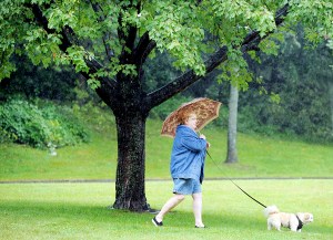 Ida Williams of Auburn takes her 10-year-old Pekingese, Leo, for a walk out front of the Roak Block Apartments in the rain on Friday. “I would not be out in this weather if it was not for him,” Williams said.