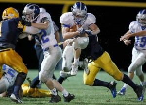 Two lost fumbles cost Mt. Blue’s offense in the first quarter. Kyle McLain and Seth Powers made the recoveries for Lawrence.