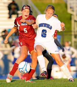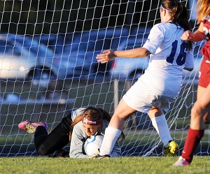 The Blue Devils threatened early in the game with shots by Adela Kalilwa and Kristina Blais. Then with 14:58 left, a loose ball in front went in off an Edward Little defender. Maegan Mathon had gotten a foot on it and steered it toward the left of the goal. Kalilwa was the nearest Blue Devil to the ball when it went in off a defender.