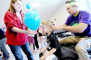 Dr. Ted Stratman measures the surface electrical activity of Erik Dube’s muscles during the 10th annual Kid’s Day America at Lewiston High School on Saturday. Stratman of Lewiston is one of five chiropractors and one of many local volunteers who treated children to a day dedicated to health, safety and environmental awareness. Stratman’s wife, Dr. Chandra Sasseville, started the event ten years ago with 50 kids in her office on Sabattus Street. More than 500 children attended Saturday’s Kid’s Day for teeth and eye screenings as well as fingerprinting and free food. The event raised more than $4,000 and all proceeds will benefit New Beginnings. Dube’s mother, Rachel Henson, is at left.