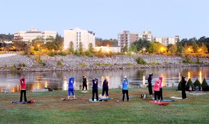 Heidi Audet leads a sunrise meditation and yoga class in Veterans Memorial Park in Lewiston on Saturday. Audet is one of more than twenty teachers from all over Maine and New Hampshire involved in the one-day Great Falls Yoga Festival. Headquartered at the Royal Oak Room and the Patrick Dempsey Center for Cancer Hope and Healing in Lewiston, the event is a fundraiser for the Auburn Public Library and YWCA of Central Maine. Event organizer Jim Wilkins of Auburn is already planning for the second yoga festival to be held next year.