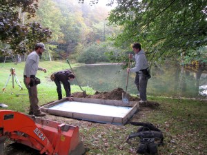 Workers prepare bases for three new benches in Abbott Park overlooking Rollo Pond on the campus of the University of Maine at Farmington on Monday. The work is in preparation for a park celebration, unveiling of a student community service project and ribbon cutting at 10 a.m. on UMF’s Charter Day, Oct. 9. The event is one of several to commemorate the 150th anniversary of the signing of the university’s charter. The bench work was done by Grimaldi Concrete Floors of Jay. From left are Jake Hiscock, Josh Hiscock and Mike Grimaldi, all of the Jay area. Marco Grimaldi was working but not in the photo.