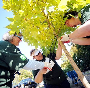 TD Bank employees, from left, Elizabeth Dickson, Heather Lagueux-Izer and Dan Demers secure a Maple tree they planted in the overflow parking lot of Community Little Theater in Auburn Wednesday as part TD Tree Days.