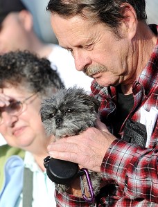 Peaches, Tannette Fitzpatrick’s three-legged pooch, wears her Sunday best to the Blessing of the Pets Friday in Lewiston.