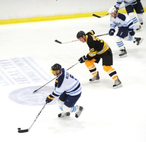 Following the first intermission of Saturday’s Battle of the Bears at the Androscoggin Bank Colisee, the University of Maine players casually skated in preparation for the second period/