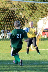 Oxford Hills Christian Academy goalie Josh Cote catches a shot by a Central Maine Christian Academy player at a recent game in Lewiston.