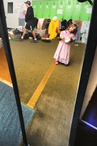 Emma Pratt, 3, of Lewiston, checks out the costume she found Saturday at the Great Falls Performing Arts Center where Community Little Theatre held a costume and fabric sale to help raise money for their programs. With more than 50,000 costumes, they plan to stay open from 9 to 11 a.m. each Saturday until Halloween.