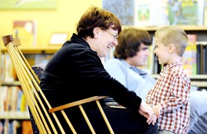 Kathy Custeau of Auburn and her 3-year-old grandson, Blake Brown of Minot, spend a rainy afternoon at the Auburn Public Library on Monday. Custeau said they are regulars during the Friday morning “Let’s Pretend” series and the Wednesday morning story time. Monday’s visit was due to the wet weather, Custeau said.
