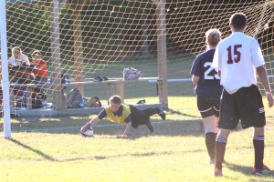 Oxford Hills Christian Academy goalie John Doyl dives to stop a shot on goal at in a recent soccer game against Living Waters Christian Academy.