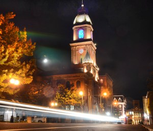 The headlights of a car streak up Pine Street in Lewiston on Thursday night in this time exposure of Lewiston City Hall lit up with recently installed lights. Crews were adjusting the lighting to make sure they were arranged properly for the formal ceremony later this month when they will be “officially” turned on.