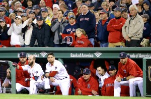 Boston Red Sox players and fans watch during the ninth inning against the Detroit Tigers in Game 1 of the American League baseball championship series Sunday, Oct. 13, 2013, in Boston. The Tigers won 1-0. (AP Photo/Matt Slocum)