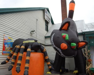 This scary-looking cat and large blow-up spider are hanging out at the Sandy River Farm Supply on Route 2 in New Sharon. These and more scenes are popping up around the area as Halloween draws near.