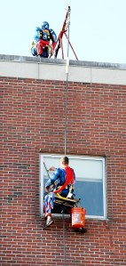 Captain America, Randy Lewis of Augusta, and Superman, Adam Wedge of Richmond, clean windows at Central Maine Medical Center in Lewiston on Tuesday. The employees of the Clean Up Group wash the hospital windows two times a year and always dress up around Halloween. “It’s for the kids,” said Ernest Cruz, who dressed up as Spider-Man.