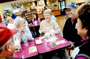 “I have a certain table there, everybody knows where I sit. I’ve been doing it for four years,” Freve said. She sips a medium coffee for two hours while they chat and catch up. “I never eat doughnuts, they’re too fattening.”
