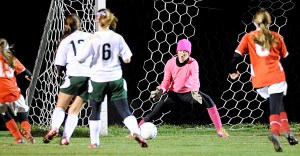 Morin took the penalty kick. Cony keeper Autumn Sudsbury made a nice save on the shot, but Morin was able to jump on the rebound and put it in at 7:57.