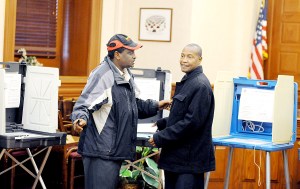 Abdullahi Daud, left, assists Abshir Bule while Bule votes at Lewiston City Hall on Friday. Lewiston has set up 14 stations for Lewiston residents to vote absentee in the city council chambers. Early voting opened Thursday and will be available from 9 a.m. to 4 p.m. until Oct. 31, City Clerk Kathy Montejo said. Lewiston voters will elect a mayor, eight school committee members and seven city councilors on Nov. 5. Voters across the state will vote on five state bond questions as well.