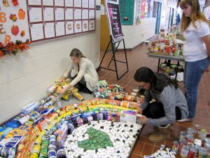 Members of the Sustainable Campus Coalition at the University of Maine at Farmington use food to create a scene of New York City, including river barges, Friday in the Student Center. The food will be donated to the Care and Share Food Closet in Farmington. Pictured is Mel Christensen, who was assisted by Samara Ethier, Katie Beach and professor Luke Kellett. People will vote for the best display, Nancy Teel, volunteer coordinator for the United Way of the Tri Valley Area, said. The Days of Caring event this year included a variety of ages and groups volunteering in several areas, she said.