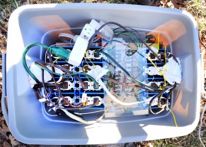 It hasn’t been without its setbacks. The computer controlling the lights sits in a dark corner of the basement, running the show. When he discovered that turning on a light in the room caused all of the yard lights to fire at once, he covered the computer and the array with a light-blocking bag. Today, he’s refined it so he just needs a black board to keep household light from interfering with this system.