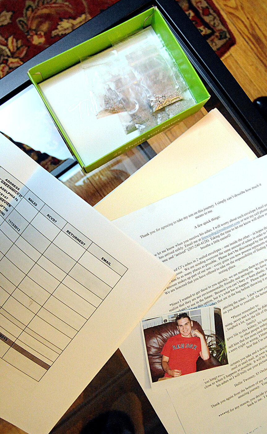 Some volunteers are planning trips in a few weeks, others months from now. When the departure date gets close, Twomey puts together a package with a thank-you note, a photo of C.J. and a small packet of ashes that she kisses goodbye before sealing it in an envelope and sending it off.