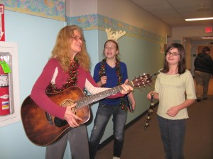 Gill, the school’s music teacher, and students Katelynn Ladd and Elise Spencer, dressed as reindeer, sang “Jingle Bells,” “Rocking Around the Christmas Tree,” “Jingle Bell Rock,” and many other holiday songs as parents, grandparents, elementary students and younger siblings visited classrooms where teachers read Christmas stories and the families made Christmas tree ornaments.