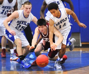 Each team was playing without one of its top scoring options. Bangor guard Alex Campbell had to sit out a game for an ejection dating back to Bangor’s Eastern A quarterfinal loss to Lewiston last season. Lewiston center Carlos Gonzalez was held out because he was ejected from the Devils’ last preseason game.