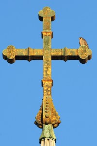 A peregrine falcon sits atop one of the steeples of the former St. Patrick’s Church on Bates Street in Lewiston Sunday afternoon. The peregrine is the world’s most widespread raptor. While many fly south for the winter, others choose to stay in an area that offers good hunting throughout the winter.