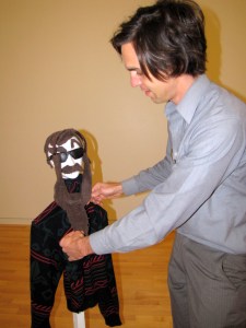 In another personal sculpture, an apple dangled from headgear. Spaced within eyesight but out of reach, the student was reflecting on eating disorders as the work restrains what goes into the mouth, he said.