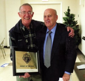 On Nov. 8 George Doiron, Grand Knight of Knights of Columbus Council 320 of Jay, presented an award for the Family of the Year to Michael and Helen Hobbs for their dedication not only to the Knights and Daughters of Isabella Circle 677, but also to the community. The award was received by Helen, top photo. Neil Bourgoin, bottom photo, was present to receive the Knight of the Year award for his dedication to the organization, to his church and the community. Doiron also announced that the mortgage for the elevator at the hall was paid in full. Everyone present at the turkey dinner gave a rousing cheer for a job well done.