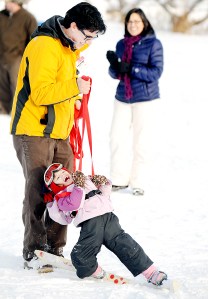 Bruno Salazar of Auburn holds his 2-year-old daughter, Anika, up with a ski trainer while her mother, Carisa, watches during the first day of the Auburn-Lewiston YMCA cross-country ski lesson program in Auburn on Sunday. About 50 children participated in the lessons at the Auburn Nordic Ski Association Trails off Perkins Ridge Road. This is the fourth year that volunteers from the community, Bates College and Auburn public schools have teamed up with the YMCA and the Lewiston-Auburn Bill Koch Ski Club to teach children how to Nordic ski.