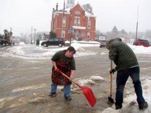 A few feet up Main Street, Java Joe’s Corner Cafe Manager Maria Stevens got some help from Assistant District Attorney James Andrews as she tried to find and open the drain for the water coming off Church Street.
