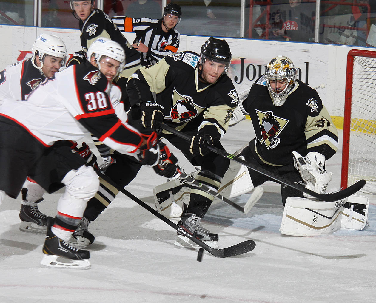The Penguins went back in front after a back-and-forth first half of the second period. With pressure down low, Portland defender Brandon Gormley lost his stick. The puck kicked out to the point and as Gormley and Pierre-Luc Letourneau-Leblond battled in front, Simon Despres fired a shot toward the cage that flew past a screened Visentin.