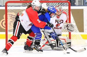 Both sides seemed to hesitate for a moment before the Devils’ Erin Hubbard picked it up and attempted to carry it behind the net. She lost the handle as she skated past the far post, however, and it squirted into the net before Fontaine could slam the door.
