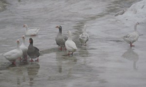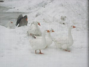 But last week, all of a sudden from the bathroom window, I saw a stream of orange beaks and webbed feet making their way around the back of the house, the west side of the house, over the huge snowbanks produced by periodic plowing, and into what is usually our old, dirt, horseshoe-shaped driveway.