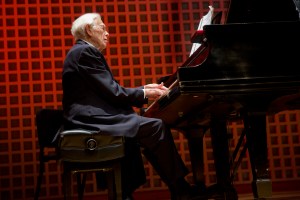 Pianist Frank Glazer plays the notes of J.S. Bach’s “Toccata in D Major, BWV 912,” the first piece on the Saturday evening’s program his 99th birthday celebration — at the Olin Arts Center Concert Hall at Bates College. He will turn 99 on Feb. 19.