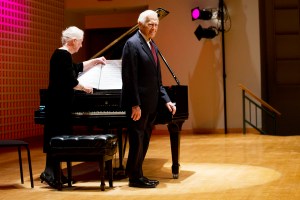 Upon entering the concert hall, pianist Frank Glazer takes a bow as his page turner, Joyce Chaplin, arranges the music for his 99th birthday celebration on Saturday at the Olin Arts Center Concert Hall at Bates College. He will turn 99 on Feb. 19.