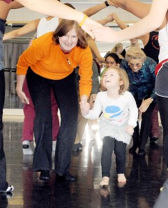 Cindy Larock and Ridley Bourgoin, 5, both of Lewiston dip and dive during a contradance rehearsal at Bates College in Lewiston on Tuesday.