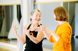 Bates College jazz-dance teacher Debi Irons, left, of Norway and folk-dance specialist Cindy Larock of Lewiston collaborate during a contradance rehearsal at Bates College in Lewiston on Tuesday.