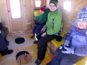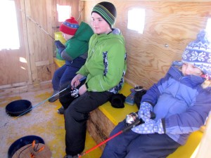 Samuel Pike, 4, of Jay, left, Ben Drumm, 9, of Wilton, center, and Cecilia Pike, 7, of Jay try their hand at ice fishing Sunday during the annual Wilton Fish & Game ice-fishing derby on Wilson Lake. The warm Fish Friendly Ice Shack was donated by state Sen. Tom Saviello of Wilton for use in helping children learn to fish. Maine Inland Fisheries and Wildlife Commissioner Chandler Woodcock of Farmington attended the presentation of the shack Sunday morning to Wilton Fish & Game members.