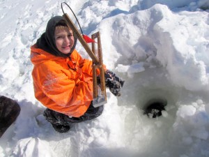 Colby Neuschwanger, 9, of Wilton checks a trap Sunday afternoon during the annual Wilton Fish & Game ice-fishing derby on Wilson Lake. Neuschwanger had just caught a 13.25 inch brook trout. He and family members had been fishing since 6 a.m. “It took a long time,” he said about catching the fish. At 2 p.m, Neuschwanger had the largest brook trout on the board, but the event still had two more hours to go.