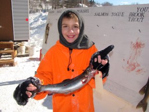 Colby Neuschwanger, 9, of Wilton holds the nearly 1-pound brook trout that he caught Sunday afternoon during the annual Wilton Fish & Game ice-fishing derby on Wilson Lake. The trout was 13.25 inches and was the leader in the youth category at 2 p.m. with two hours of the event to go. Neuschwanger and family members had been fishing since 6 a.m. “It took a while,” he said, to catch it, but despite cold winds blowing across the lake, he was having a good time.