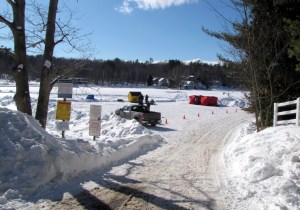 The Fish Friendly Ice Shack, left, and other tents used for the free Family Fishing Clinic are pictured near the boat launch at Wilson Lake in Wilton Sunday during the Wilton Fish & Game annual ice-fishing derby. Several shacks farther out on the lake are hard to see, as wind-drifted snow covered some roads on the ice, Alan Hart, an organizer, said.