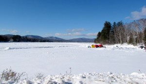 The yellow Fish Friendly Ice Shack, left, was donated to Wilton Fish & Game Sunday by state Sen. Tom Saviello of Wilton during the annual ice-fishing derby on Wilson Lake. The red tents were used for a free Family Fishing Clinic held by Emily MacCabe from the Maine Department of Inland Fisheries and Wildlife’s Hooked on Fishing program. A lot of children came out to try ice-fishing despite the cold winds blowing across the lake.