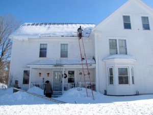 Richard Austin of Industry passes a snow rake up to one of his workers on a roof at an apartment building on High Street in Farmington on Monday. Austin said it was their second house of the day and they had four more to do.