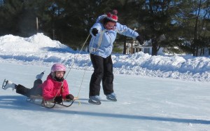 Emma Guagnini, 10, is pulled by her mother, Elaine Guagnini of Massachusetts, at the ice skating rink on Cottage Street in Norway on Monday. They and other family members enjoyed a cold, but sunny morning while in town visiting relatives.