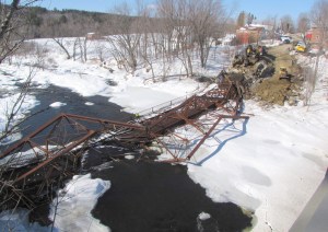 Steel on the 1916 iron bridge was cast into the concrete abutment closest to the Farmington end, which prevented the bridge from initially dropping into the Sandy River on Thursday, according to Andy McPherson, project manager with CPM Constructors of Freeport. That casting was not shown on the old bridge plans, he said.